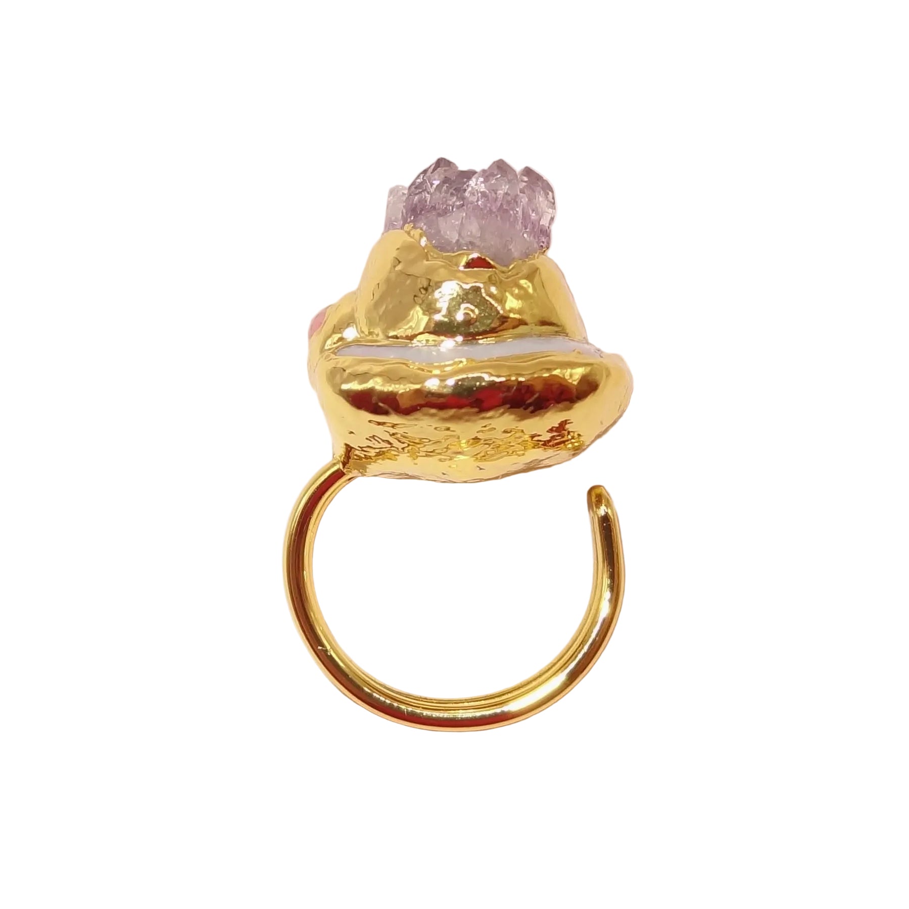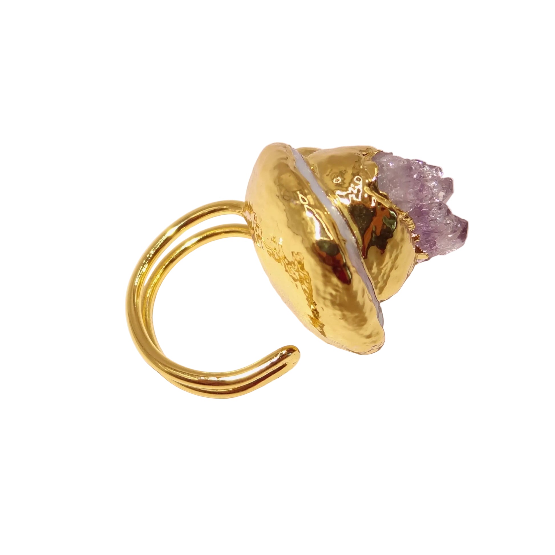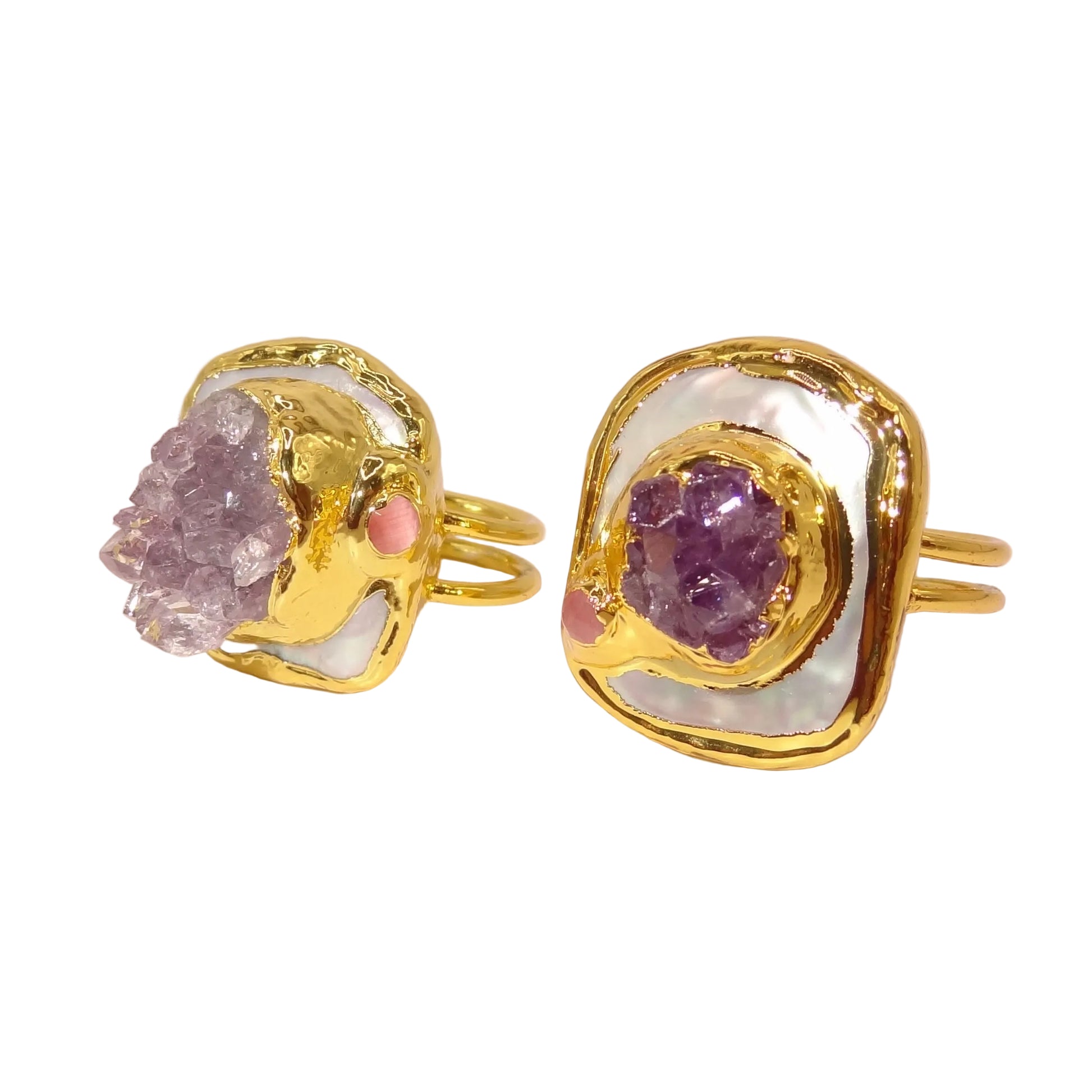 The Alana Ring features a square pearl base with a dimensional amethyst crystal center. This ring is handmade, and therefore no two are exactly alike. The photo is simply for reference, but each piece will be 1 of 1 and unique just like you! The placement of gems, shape of crystals, and colors will vary. Adjustable and tarnish resistant.