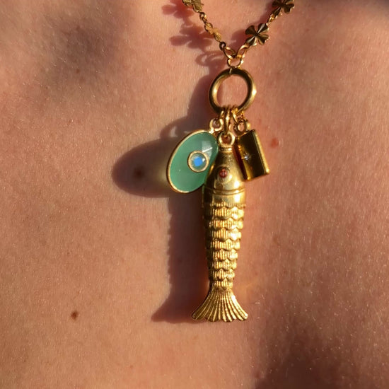 The Cora Necklace features three charms joined with the intention of encouraging one to be more present in the now by trusting the energies of the future. It features a genuine faceted aqua calcedony stone which is known for its soothing and calming energy, therefore brining an element of tranquility. It's complimented by a golden fish to represent good fortune, and a tiny north star bar charm to represent hope.